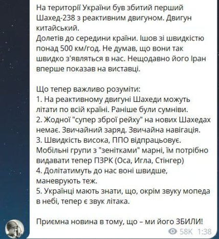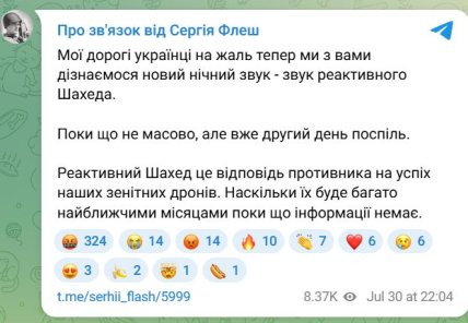 "Мои дорогие украинцы, к сожалению, теперь мы с вами узнаем новый ночной звук — звук реактивного Шахеда", — написал Бескрестнов.