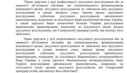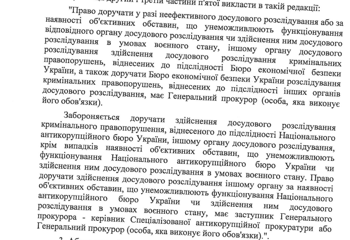 Генеральный прокурор получил право давать письменные указания относительно передачи материалов дел всем следственным органам — кроме НАБУ. Он не может вмешиваться в работу детективов или подразделения внутреннего контроля Бюро. Это сохраняет определённый уровень независимости НАБУ.
