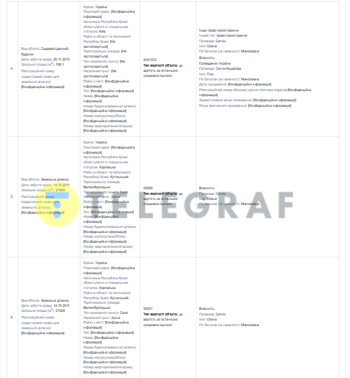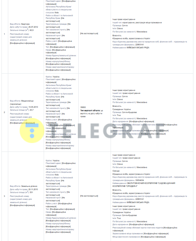 Елена Сытник прописана в столичной квартире, которая принадлежит Киевскому городскому совету. В этом же городе у нее есть право пользования на паркоместо, земельный участок и дачный дом. Также ей принадлежат два земельных участка в Харьковской области, которые она приобрела в 2011 году за 55 006 гривен и 50 251 гривен.