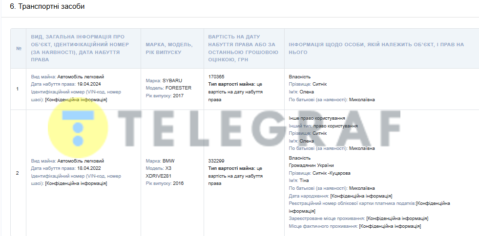 В графе транспортных средств указано, что в 2024 году Сытник купила автомобиль Subaru Forester 2017 года выпуска за 170 365 гривен.