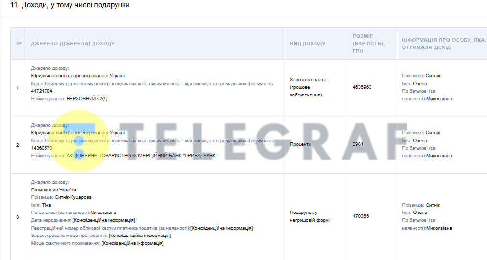 В прошлом году судья заработала 4 635 963 гривен. Также она получила проценты в банке в размере 2 981 гривен. В то же время ей был предоставлен подарок в неденежно форме на сумму 170 365 гривен. Это ровно столько, сколько стоит ее автомобиль.