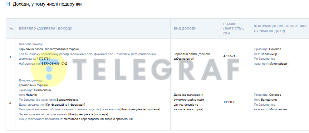 За 2024 год заработная плата судьи составила 4762521 гривен. Также он получил 1 350 000 в качестве дохода от отчуждения движимого имущества.