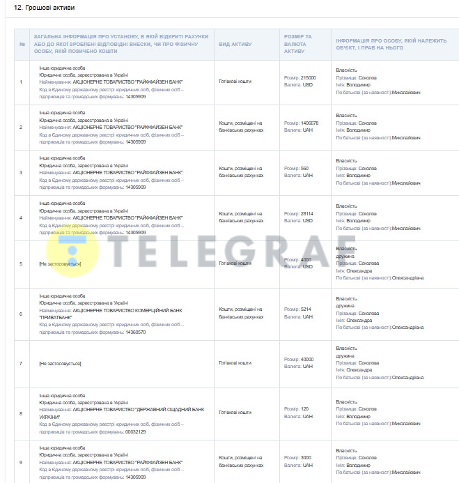 Отмечается, что Соколов хранит наличными 215 000 долларов и 120 гривен. А его супруга — 40 000 гривен и 4 000 долларов. На банковских счетах у судьи есть в целом 1 410 238 гривен и 28 114 долларов. У его жены на банковских счетах — 5 214 гривен.