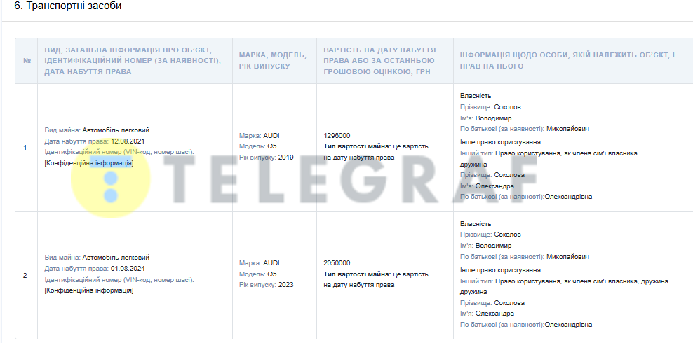 В графе транспортных средств указано, что у Соколова есть два автомобиля. Первый — Audi Q5 2019 года выпуска, который судья приобрел в 2021 году за 1 296 000 гривен. Второй — Audi Q5 2023 года выпуска, который Соколов приобрел в 2024 году за 2 050 000 гривен.