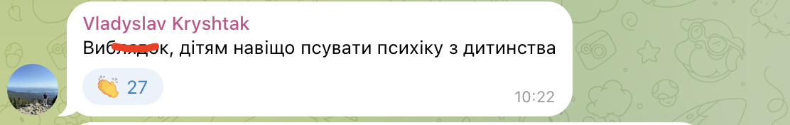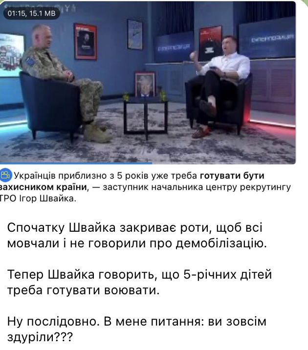 "Сначала Швайка закрывает роты, чтобы все молчали и не говорили о демобилизации. Теперь Швайка говорит, что 5-летних детей нужно готовить воевать. Ну последовательно", — говорится в сообщении.