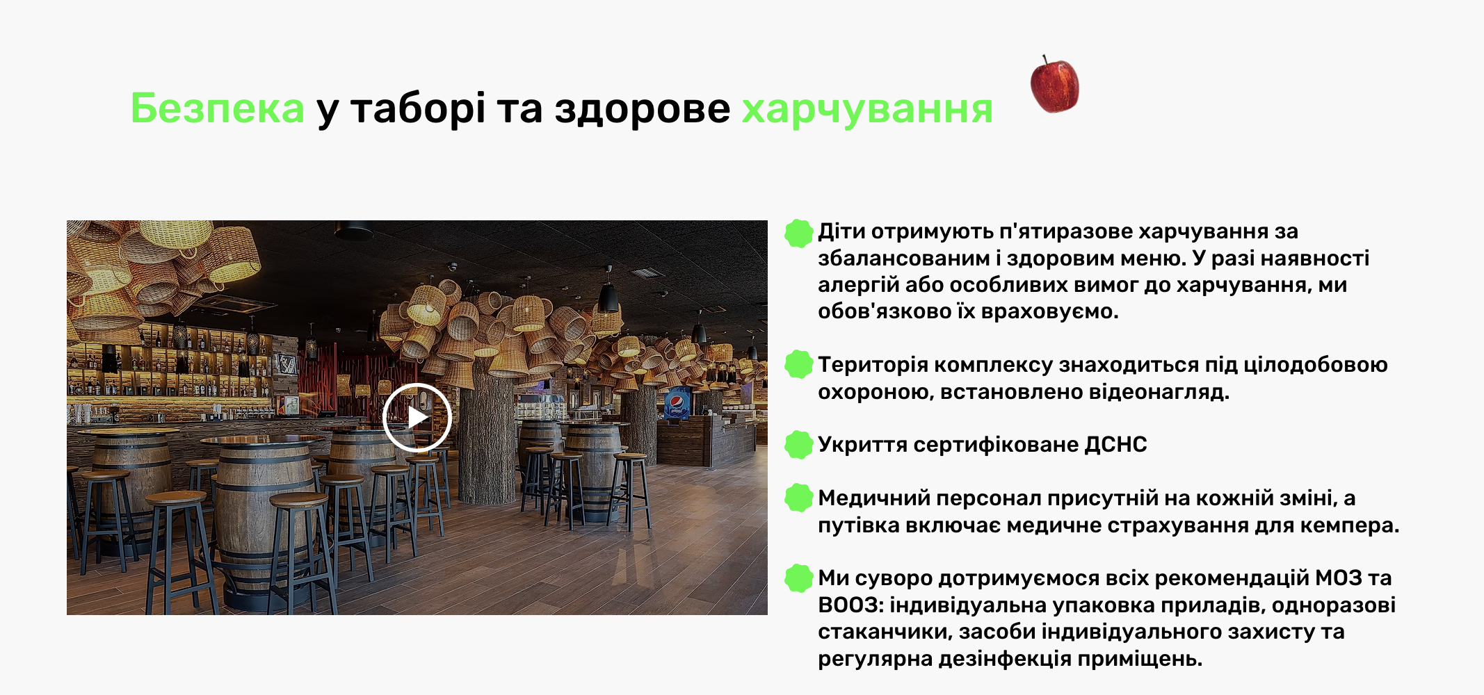 Интересно, что лагерь предоставляет всем детям медицинскую страховку и обещает соблюдение стандартов МОЗ/ВОЗ (дезинфекция, одноразовая посуда и т.п.). Но, учитывая массовое отравление детей, к этому есть вопрос.