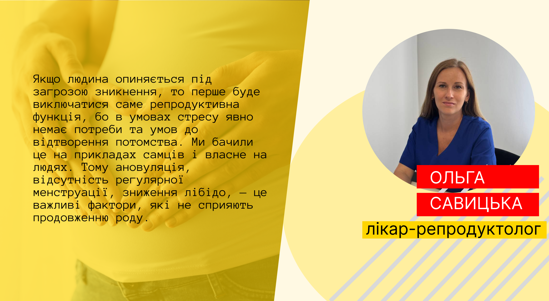 Каждое утро украинцы просыпаются, и первым делом читают новости с волнением, не произошло ли чего-то страшного. А гормоны гонадотропины дают толчок яичникам для правильной работы. Они производятся во время здорового сна. Но какой может быть сон, если ночи люди проводят в паркингах, укрытиях. Происходит депривация сна. У женщин постоянный стресс и высокий уровень кортизола, адреналина. Они блокируют овуляцию. Так устроен наш организм.