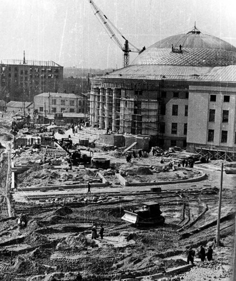 На втором плане фото видно еще одно знаковое здание — расположенный неподалеку Киевский государственный цирк. Этот цирк в стиле советского неоклассицизма с большим куполом и колоннами является важнейшей архитектурной доминантой города. Он не только служил местом развлечений и культурных мероприятий, но и был символом возрождения и развития культурной жизни Киева после войны.