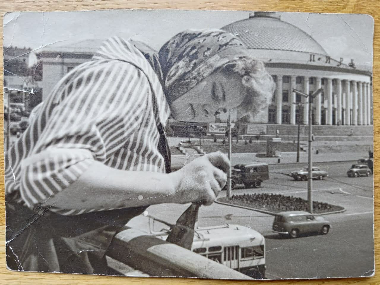 На фото – панорама города, а на переднем плане – женщина, сосредоточенная на своей работе. Это последние дни перед сдачей нового жилого дома по адресу и каждая минута на счету. Работница держит в руках инструмент, ее взгляд говорит о полной преданности делу — черта, присущая поколению послевоенных лет.