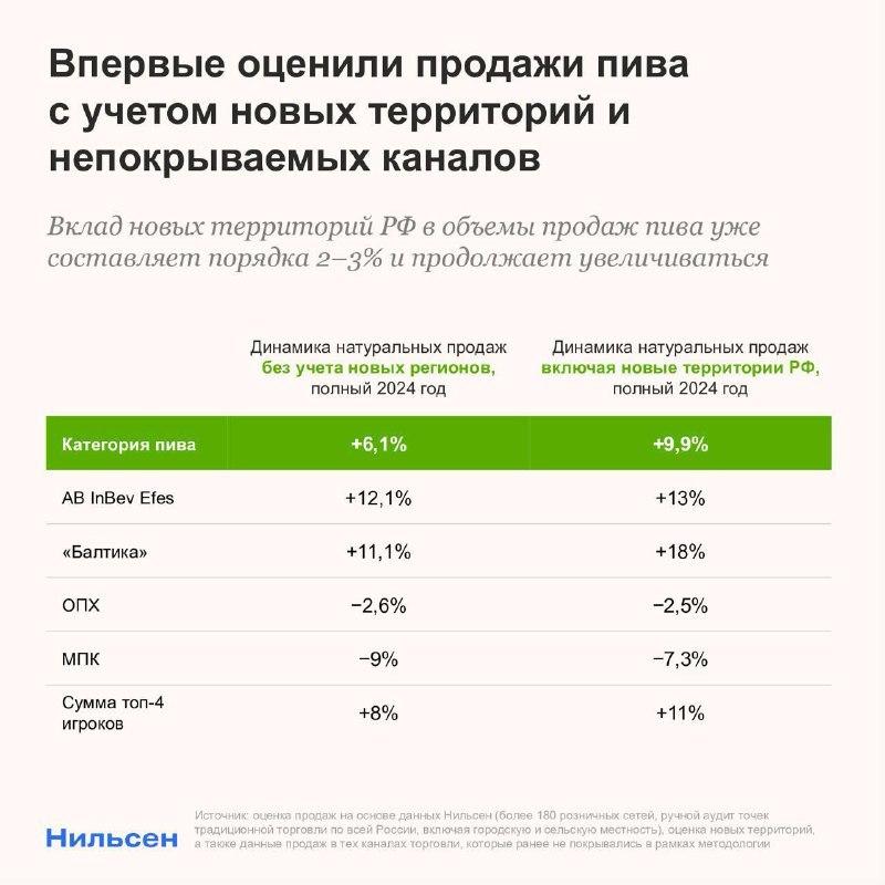 Согласно данным исследования, новые территории Российской Федерации (т.е. оккупированные украинские земли) составляют примерно 2–3% объема продаж пива. Nielsen также отметила, что в 2024 году рост продаж пива "в пределах традиционных границ России" (такую формулировку использовала компания) составил 6%. В случае учета "новых территорий" рост достиг 10%.