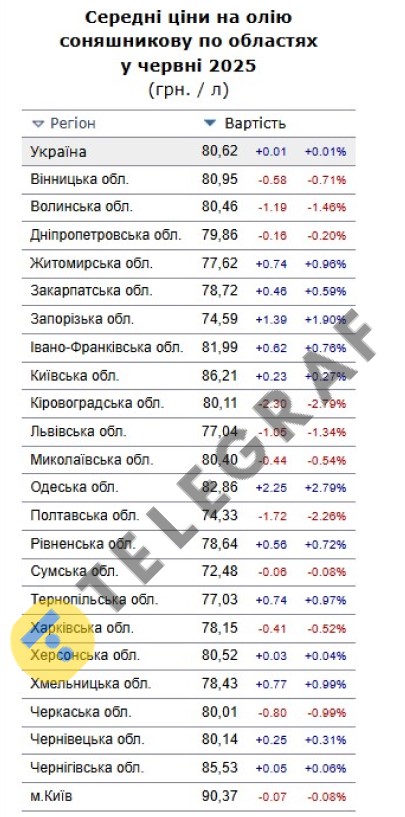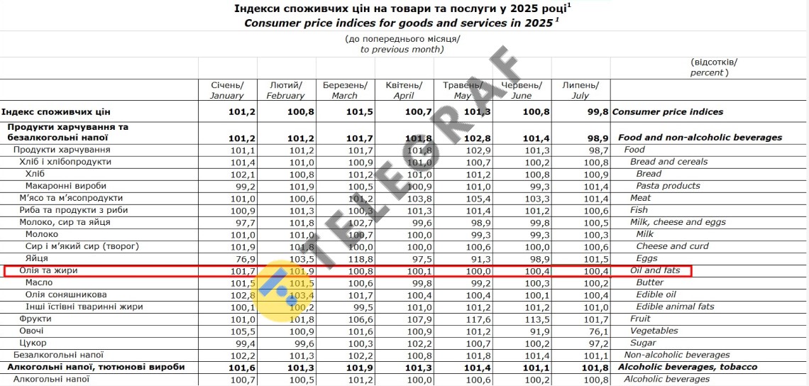 Розничные цены на растительное масло начали расти еще в июне-июле. По данным Минфина, в июне 2025 года средняя цена на растительное масло была 80,62 гривны.