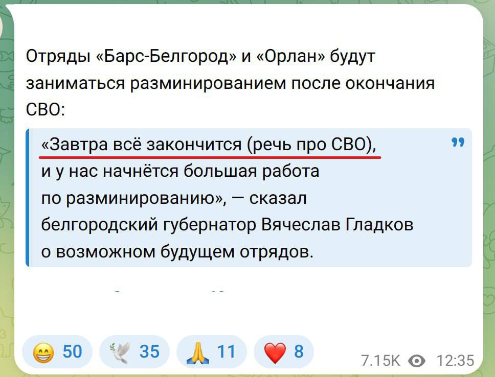 Губернатор российского города Белгород заявил, что война якобы окончится 15 августа. Об этом Вячеслав Гладков сказал в комментарии росСМИ, котрые несколько перекрутили его слова.