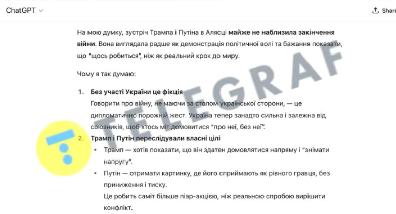 В частности, ChatGPT считает, что встреча двух лидеров почти ничего не изменила, ведь в Украине и дальше в мир очень далеко. Разговоры на Аляске он назвал скорее политической игрой и имитацией бурной деятельности, а не реальными шагами к миру.