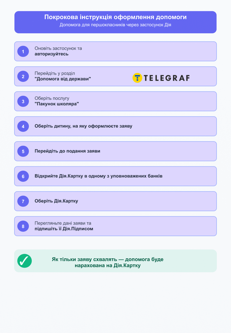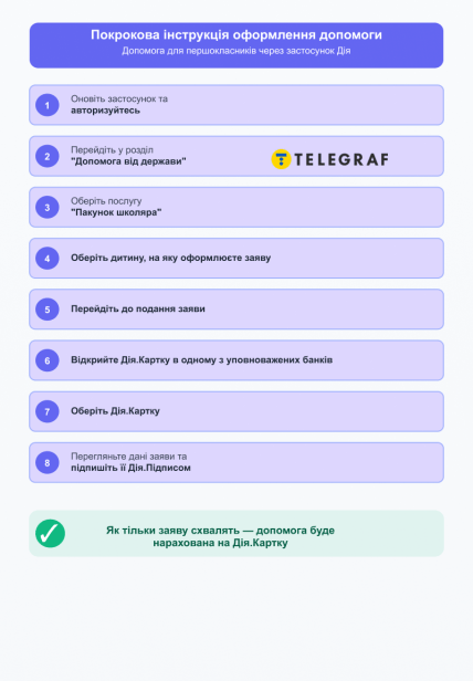 Подавайте заявление до 15 ноября в приложении Дия и используйте средства в течение 180 дней после начисления. Помощь может получить только один из родителей или законных представителей ребенка.