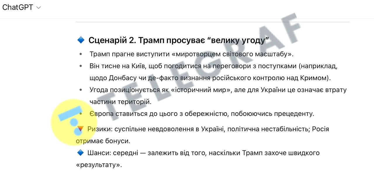 Трамп стремится закрепиться в роли миротворца мирового масштаба. Для этого во втором варианте он окажет давление на Киев, чтобы тот согласился на переговоры с уступками, например, относительно Донбасса или фактического признания российского контроля над Крымом. Такое соглашение могут представить как "исторический мир", однако для Украины оно будет означать потерю части территорий. В Европе к этому подходу относятся с настороженностью, опасаясь создания опасного прецедента.