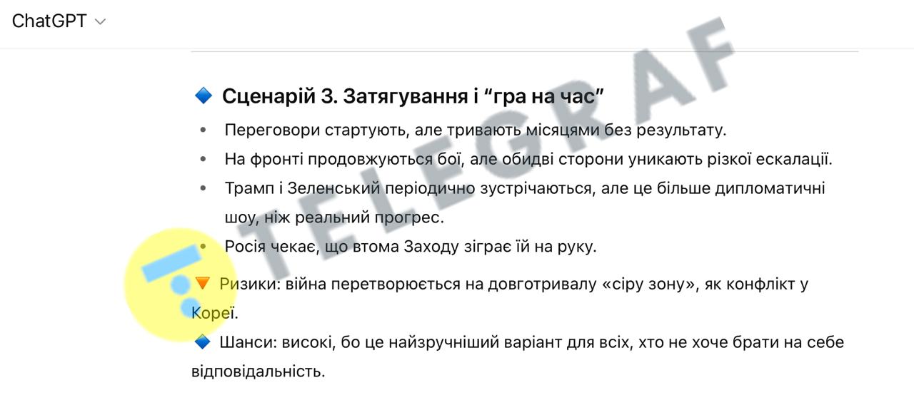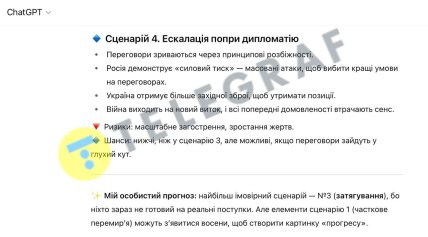 Шансы реализации этого сценария ИИ оценил как средние, поскольку все стороны истощены войной, но никто не готов к существенным уступкам.