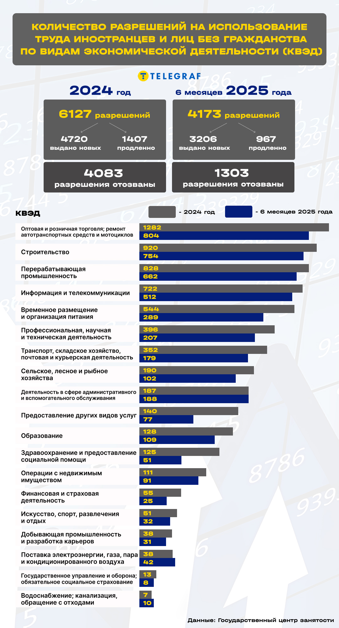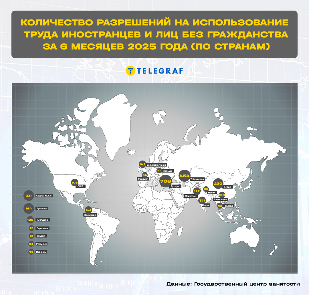 Среди двух десятков стран, последние полтора года ТОП-3 поставщиками рабочей силы в Госцентре занятости в ответе на запрос "Телеграфа" называют Турцию, Узбекистан и Индию. В прошлом году с 4-го по 10-е место по количеству работников дали Китай, Азербайджан, Великобритания и США, Бангладеш, Франция и Германия. В этом году на этих позициях остались только две страны — Великобритания и Бангладеш, остальных лидеров заменили Армения, Колумбия, Пакистан и Республика Молдова.