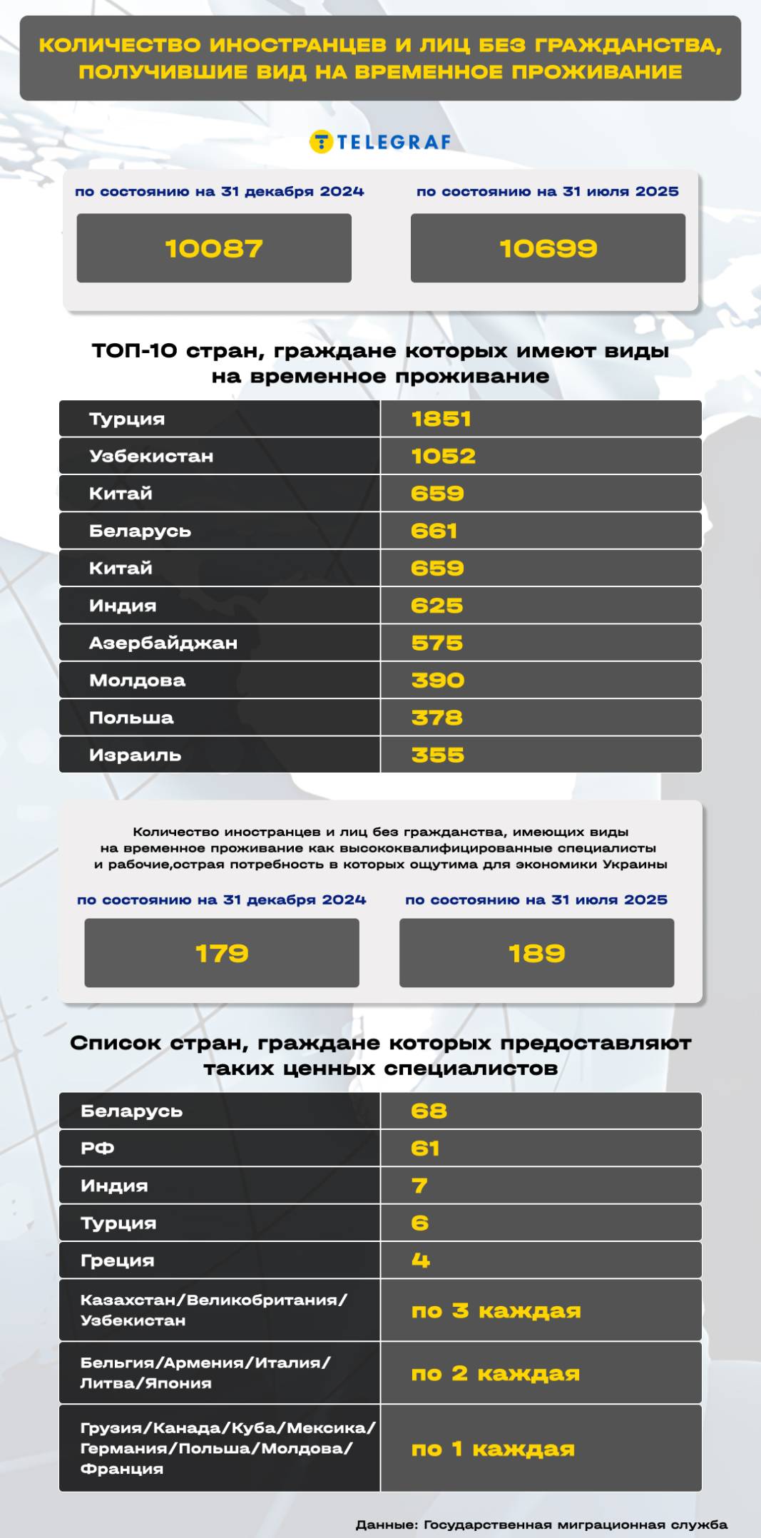 При этом по данным Государственной миграционной службы, временные виды на проживание в связи с трудоустройством на конец июля этого года есть у более 10 тыс. иностранцев. И в этом рейтинге кроме Турции, Узбекистана, Китая и Индии есть также Беларусь, граждане которой имеют такие документы в почти том же количестве (более 600), что и индусы и китайцы. Почти по 400 видов на руках у граждан Молдовы и Польши, а более 300 – Израиля, Грузии и Великобритании.