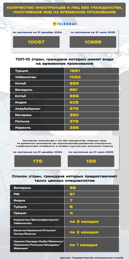 Государственная миграционная служба также отдельно сообщает об иностранцах, получивших виды на временное проживание "как высококвалифицированные специалисты и работники, острая потребность в которых ощутима для экономики Украины". Таких в общей сложности менее двухсот. Здесь в лидерах неожиданно находится Белоруссия и РФ, а кроме того одиночных "ценных" кадров предоставляет Индия, Турция, Греция и другие страны.