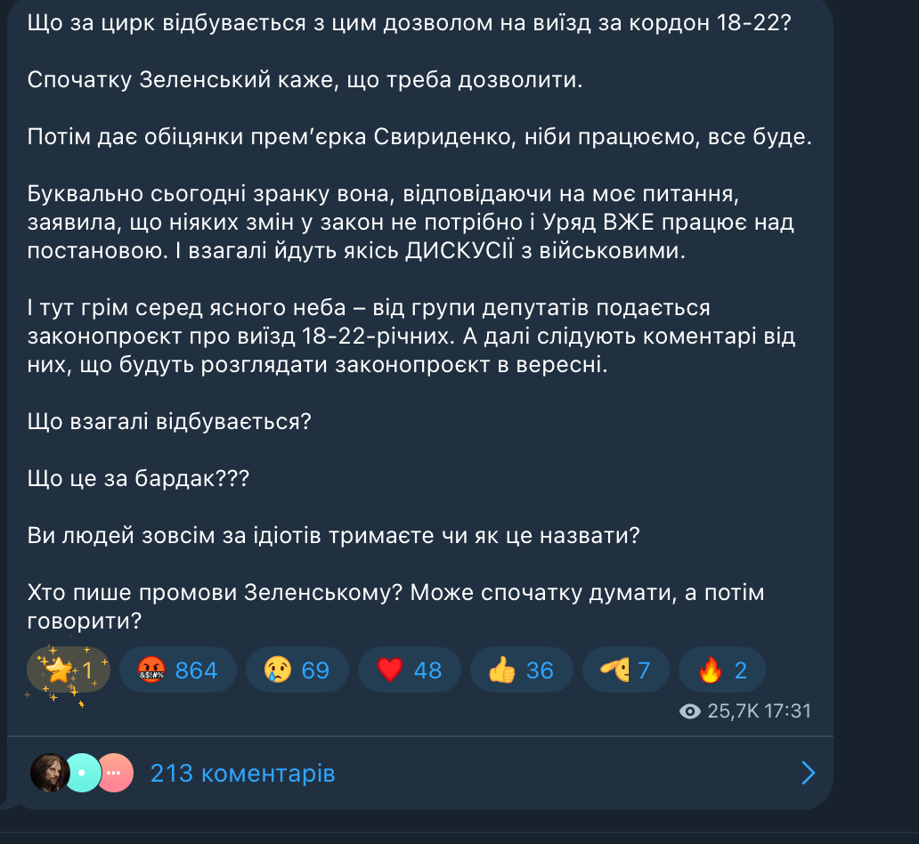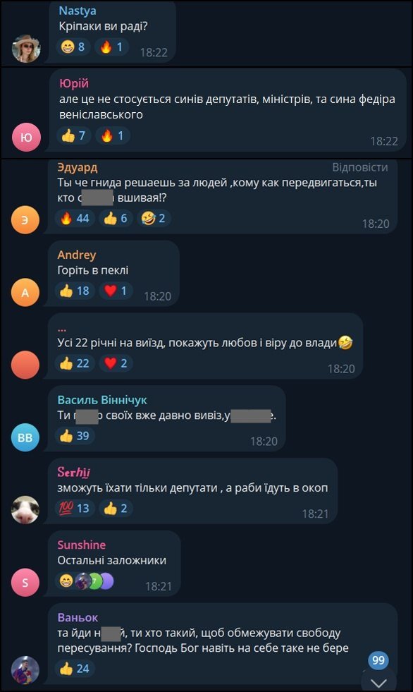 И вот что пишут украинцы об этом законопроекте. Они возмущены тем, что предлагают нардепы. Большинство комментаторов было возмущено. Они пишут, что на Украине так может никого не остаться.