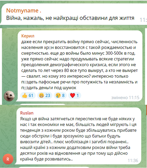 Оценки правительства не оптимистичны — за чуть более 15 лет, население может остаться 29 млн. Восстановление возможно только в условиях мира, экономической стабилизации и возвращения беженцев. Главное, чтобы не шла война, считают украинцы.