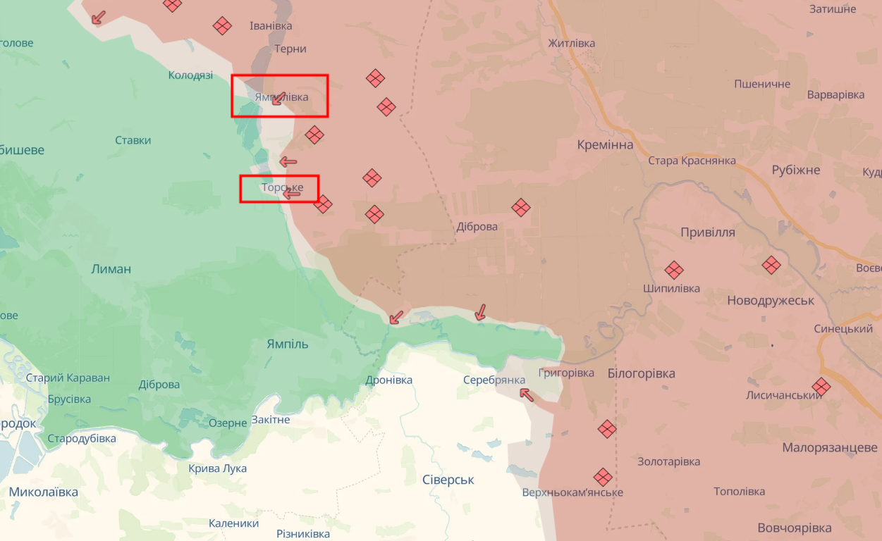Об этом сообщает аналитический портал deepstate, следящий за ситуацией на фронте. По данным аналитиков, враг продвинулся в Серебрянском лесничестве, вблизи Торского и Ямполевки. На основе изменений на карте deepstate блоггер Роман Шрайк высчитал, что Украина потеряла 23,4 квадратных километров в день.