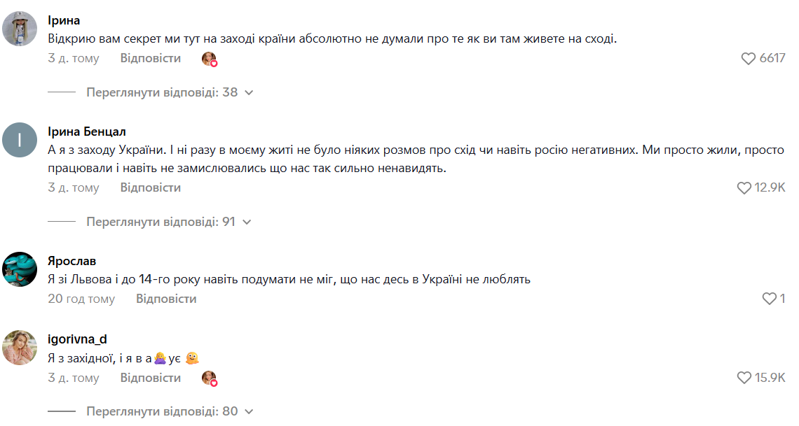 "Мы, с запада Украины, никогда не думали о востоке плохо. Мы просто жили своей жизнью, работали, берегли свою культуру и традиции", — добавляет другая.