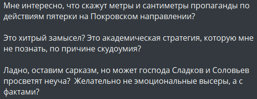 Еще один российский пропагандист открыто критикует командование армии РФ, намекая, что провал на Покровском направлении – это не "стратегическая уловка", а следствие дезорганизации.