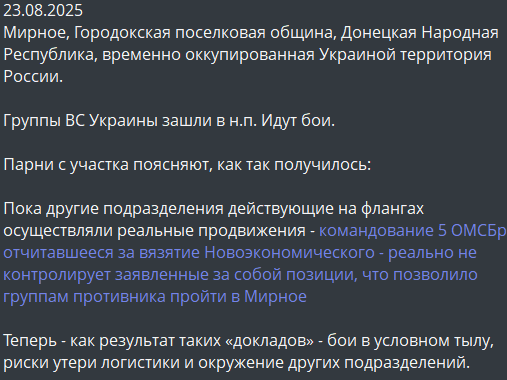 Информацию о входе ВСУ в Мирное подтверждают и сами россияне. Один из российских военкоров пишет, что украинские подразделения зашли в населенный пункт и сейчас там продолжаются бои. Он добавляет, что из-за "откровенной лжи" командования 5-й мотострелковой бригады РФ, ранее отчитавшейся о контроле над Новоэкономическим, возникла угроза для флангов и логистики.