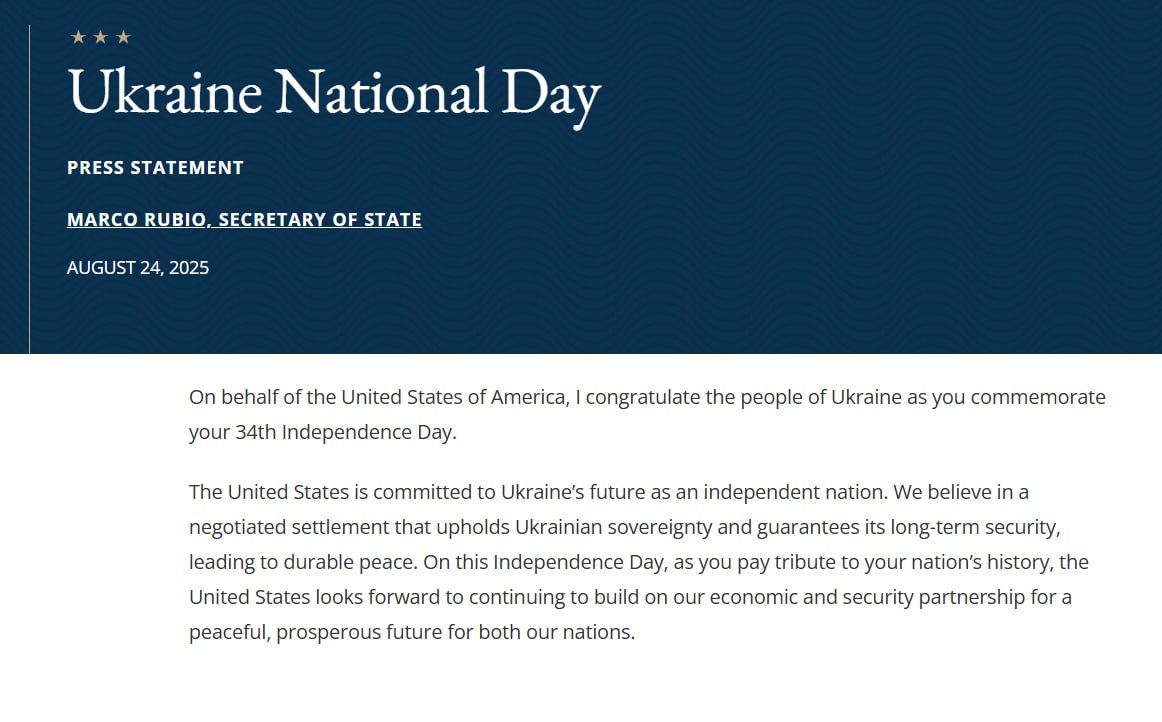 Рубио поздравил украинцев с 34-й годовщиной Независимости и заверил, что США преданы будущему Украины как независимому государству.