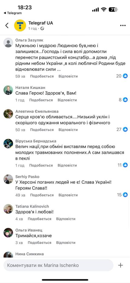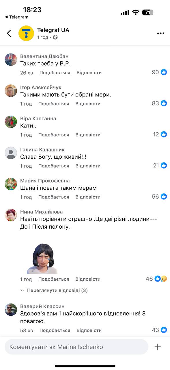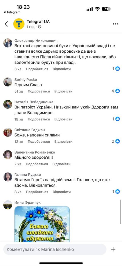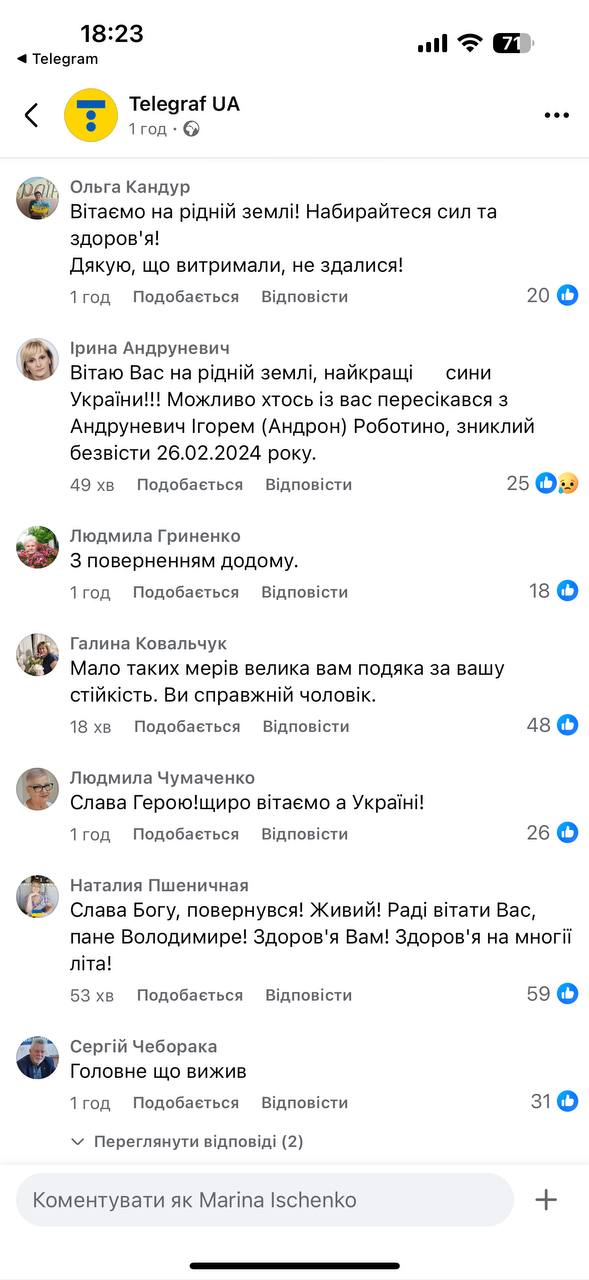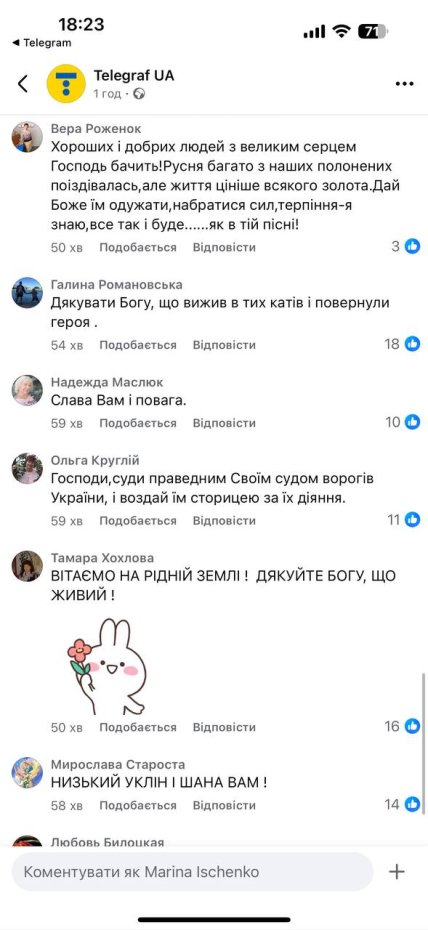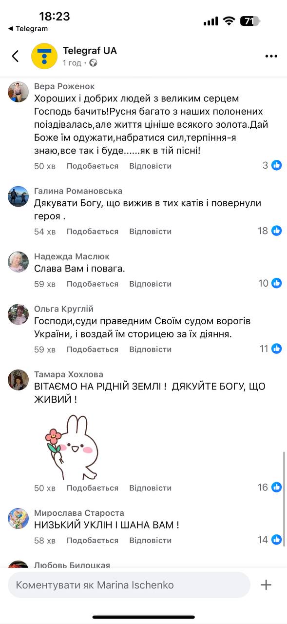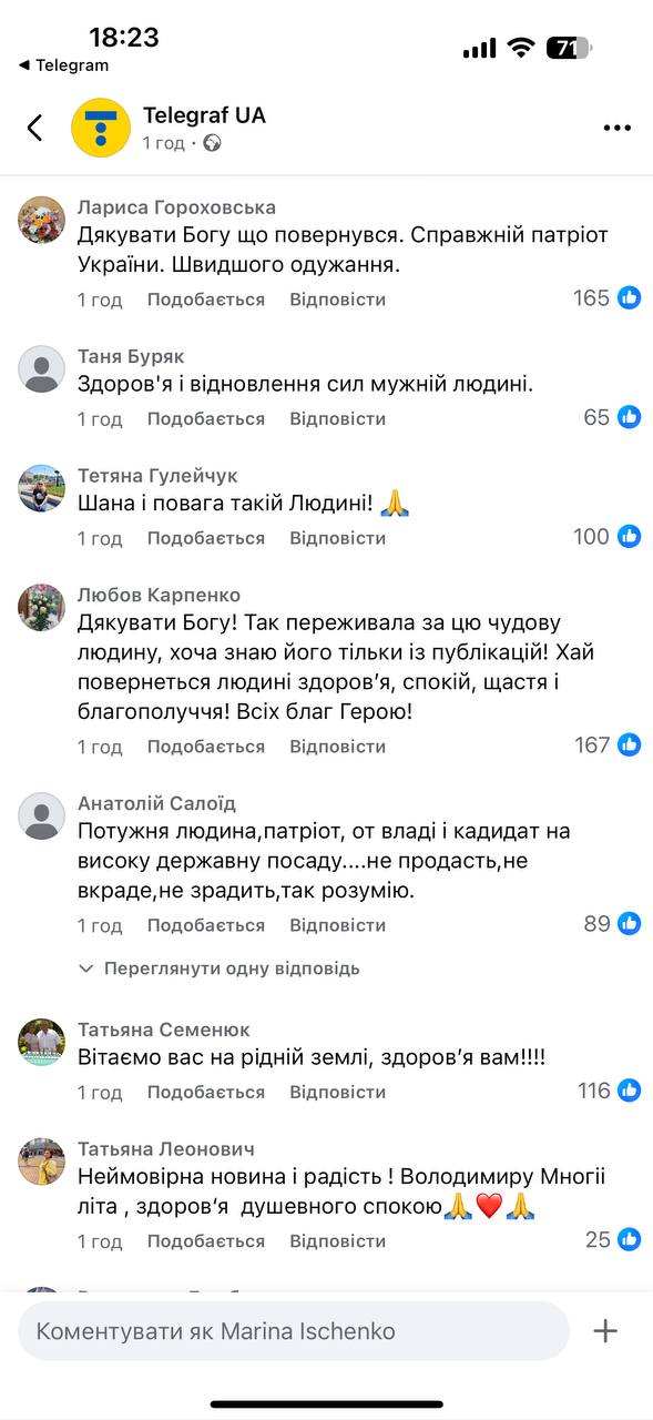 Многие выражают благодарность Богу за возвращение и желают быстрого выздоровления. Они пишут о радости от того, что героя наконец-то освободили из русского плена, и желают ему крепкого здоровья.