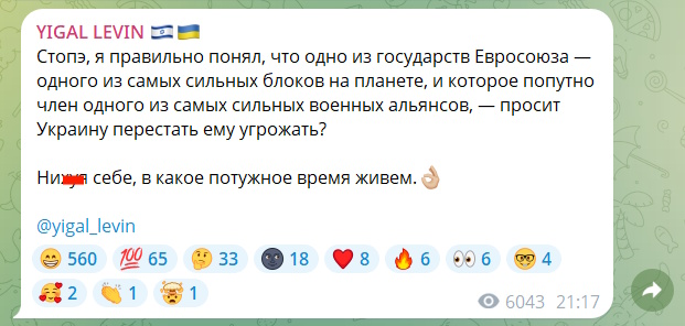 Военный аналитик и офицер армии Израиля Игаль Левин тоже пошутил на эту тему, напомнив, что Венгрия чувствует угрозу даже несмотря на то, что является членом ЕС и НАТО.