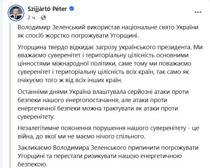 Об этом сообщил глава МИД Венгрии Петер Сийярто в своем Facebook. По его словам, Будапешт расценивает слова Зеленского, как угрозу.