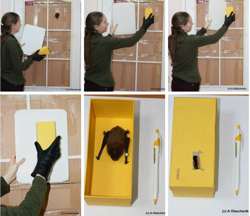 Если же нашли летучую мышь спящей, то безопасно ее можно вынести с помощью коробки. Делать это нужно также в плотных перчатках, понадобится картонная коробка и лист картона. В коробке должно быть отверстие, чтобы животное дышало, если до вечера еще есть время.