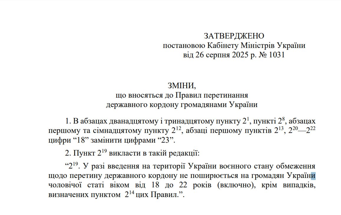 По распространенной в настоящее время информации с момента вступления в силу принятых изменений право пересекать государственную границу Украины в случае введения на территории Украины военного положения будут иметь граждане Украины мужского пола в возрасте от 18 до 22 года включительно