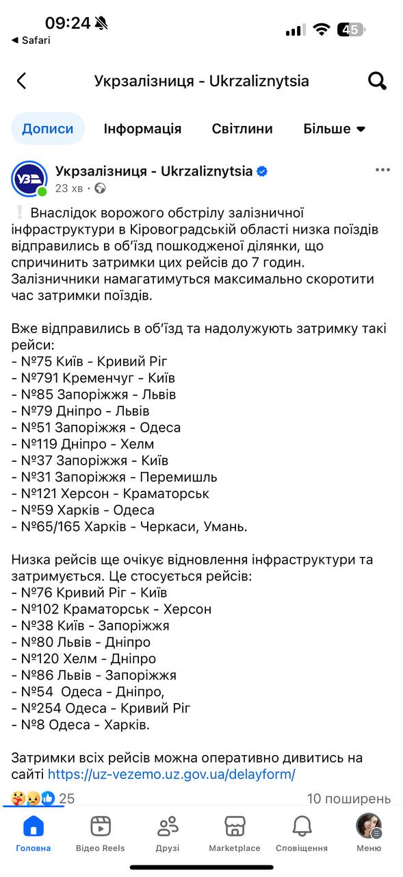 В результате удара по Кировоградской области ряд поездов отправились в объезд поврежденного участка. Это может привести к задержке движения до 7 часов.