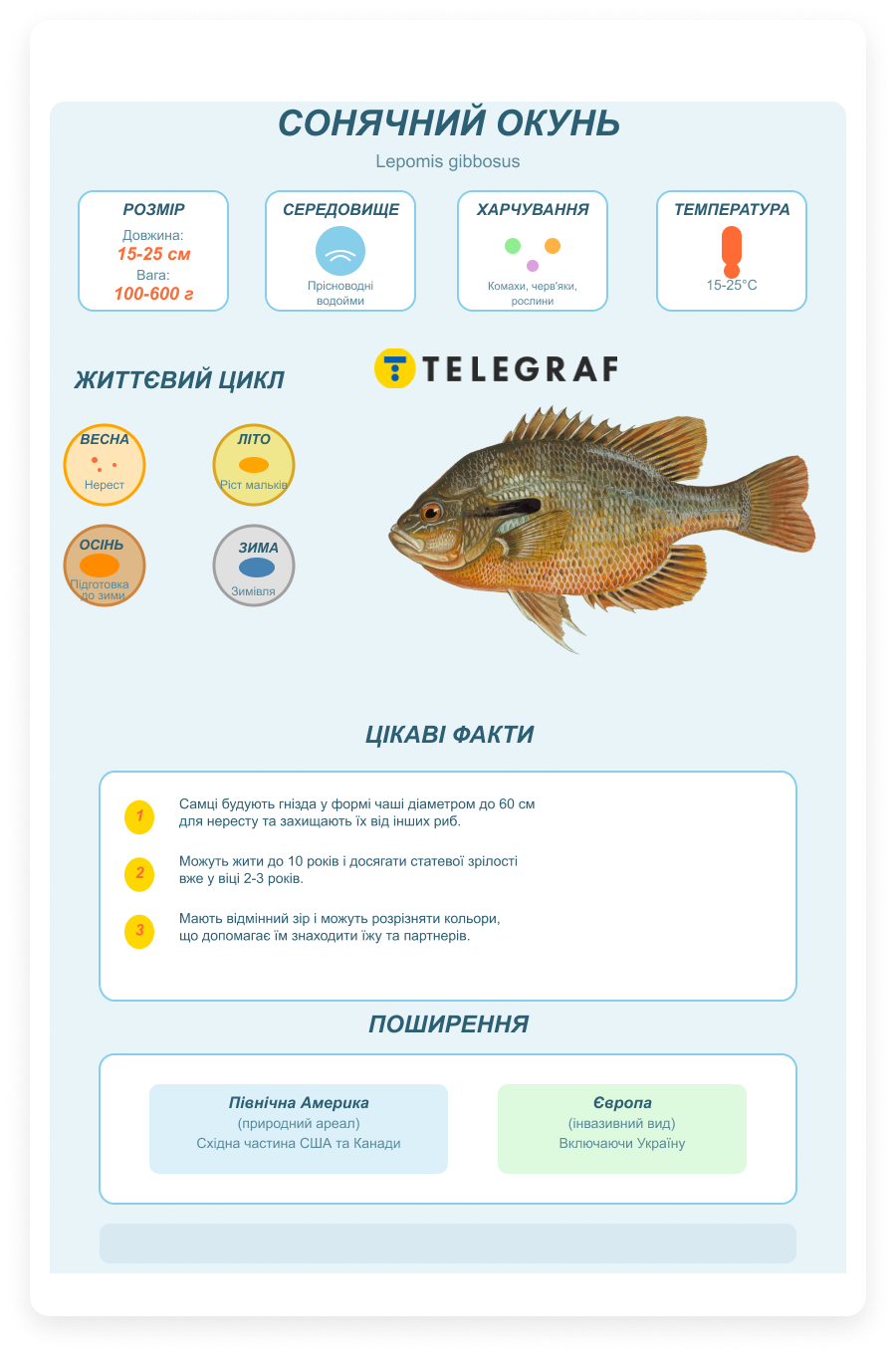 Солнечный окунь (Lepomis gibbosus) действительно инвазивный вид для Украины. Эта рыба родом из Северной Америки, откуда была завезена в европейские водоемы в XIX-XX веках. В Украине солнечный окунь появился относительно недавно и постепенно расселяется по разным водоемам.