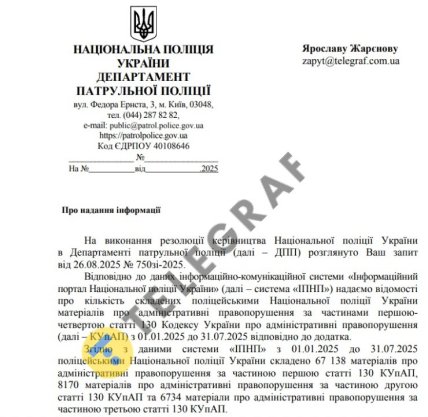 Чтобы узнать реальную картину количества пьяных водителей на дорогах, "Телеграф" обратился с запросом в Департамент патрульной полиции Национальной полиции Украины. Согласно официальной информации, с начала 2025 года по конец июля полицейские составили 67 138 протоколов по части первой статьи 130 Кодекса Украины об административных правонарушениях. Это управление транспортом в состоянии алкогольного, наркотического или иного опьянения наиболее распространенный вид такого нарушения.