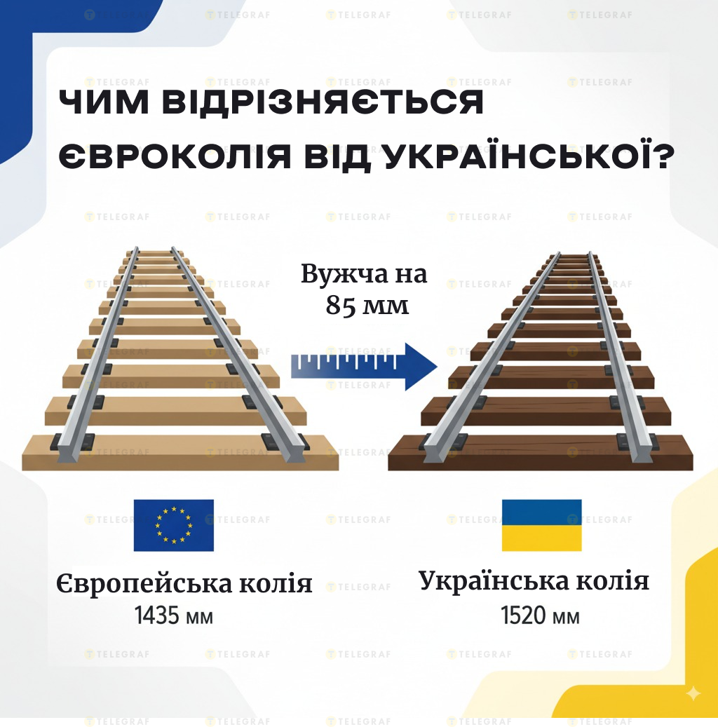 Украинские пути значительно шире европейских, поэтому поезда не могут идти беспрепятственно. Разница почти 10 см. Это наглядно показано на инфографике.