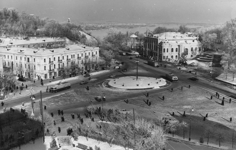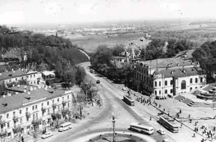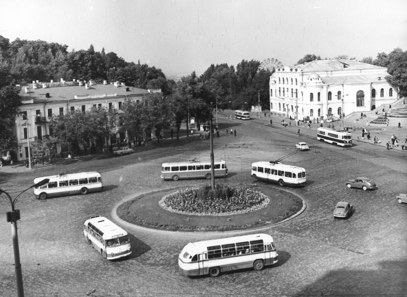 На фото, сделанных в 1961 году, еще нет ни музея, ни современного Украинского дома, которые сейчас находятся на этой площади. Однако рядом уже установлено смотровое колесо – аттракцион, привлекавший киевлян и гостей города.