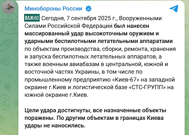 Цели удара достигнуты, все назначенные объекты поражены. По другим объектам в границах Киева удары не наносились.
