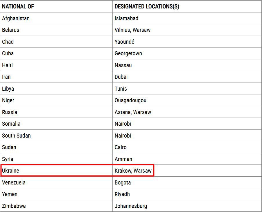 Информация об этом размещена на сайте Бюро консульских дел Государственного департамента США. Для заявителей из разных стран определены места приема заявлений на получение неиммиграционных виз. Украинцы могут подать заявления только в Польше — Краков и Варшава. В Киеве это сделать теперь невозможно.