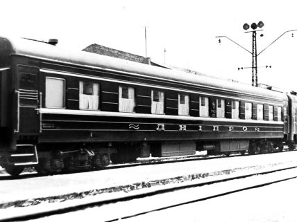 Так выглядели вагоны фирменного поезда "Днiпро" Днепропетровск – Киев. Сегодня у него типовые для "Укрзализныци" сине-желтые цвета и надпись.