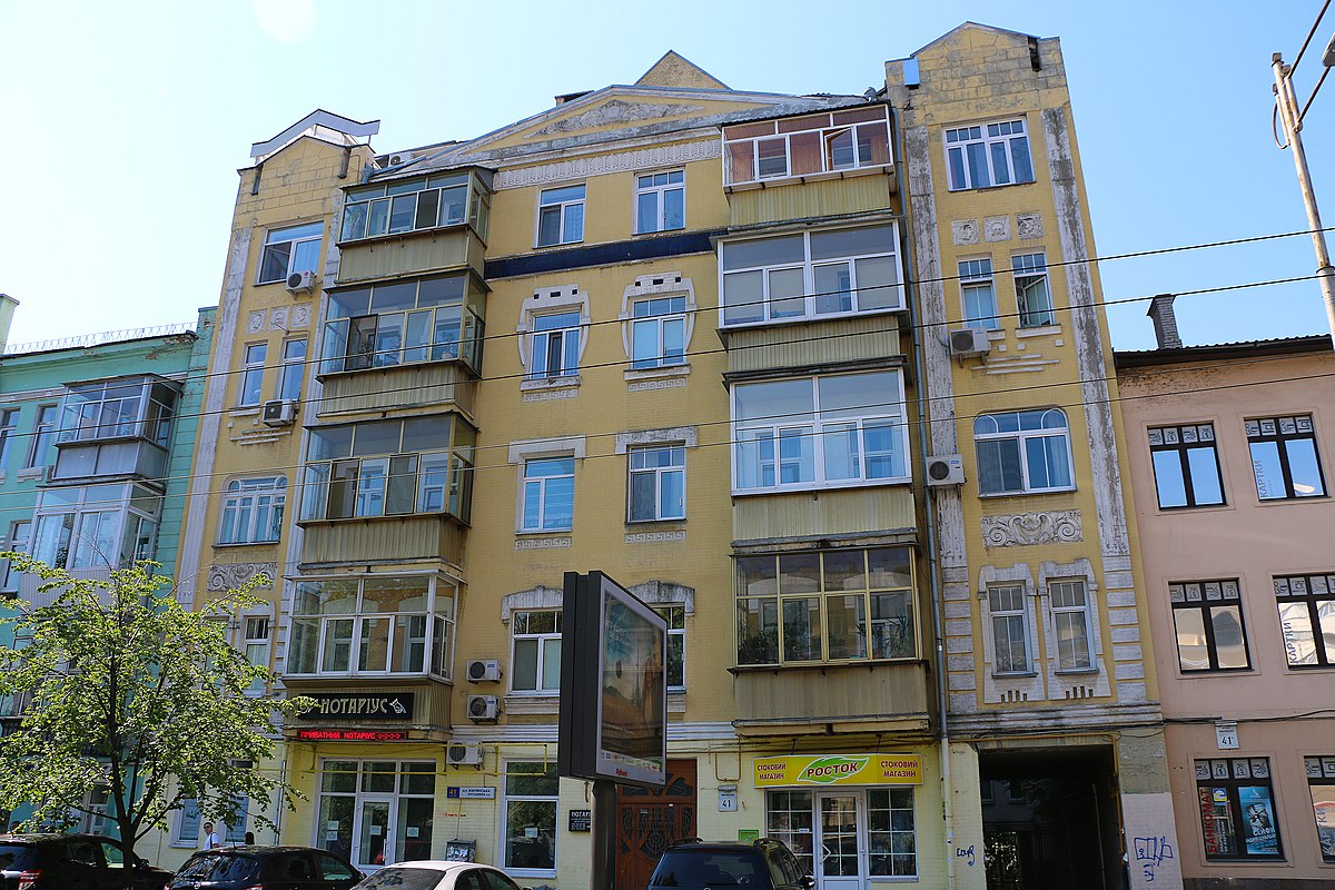 Пятиэтажное здание № 41 построено в стиле неоклассицистического модерна. В первой четверти XX века оно принадлежало киевскому мещанину В. Беренфусу, далее было собственностью торговой фирмы "Торговый дом К. Людмер и сыновья", а с 1913 года стало собственностью купца В. Шевелева.