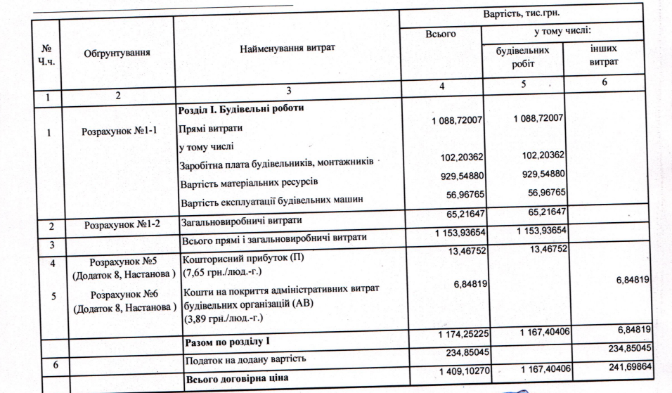 В смете заложено более миллиона гривен прямых затрат, из которых более 929 тысяч приходится на материалы, 102 тысячи — на оплату труда строителей, а почти 57 тысяч — на использование техники. Дополнительно в расходы включены общепроизводственные статьи на 65 тысяч гривен, административные расходы в размере 6,8 тысячи и прибыль подрядчика, которая составила 13,5 тысячи гривен.
