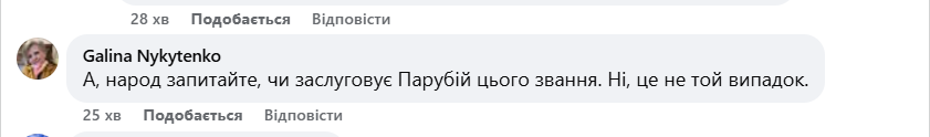 А народ спросите, заслуживает ли Парубий этого звания. Нет, это не тот случай, — пишет женщина