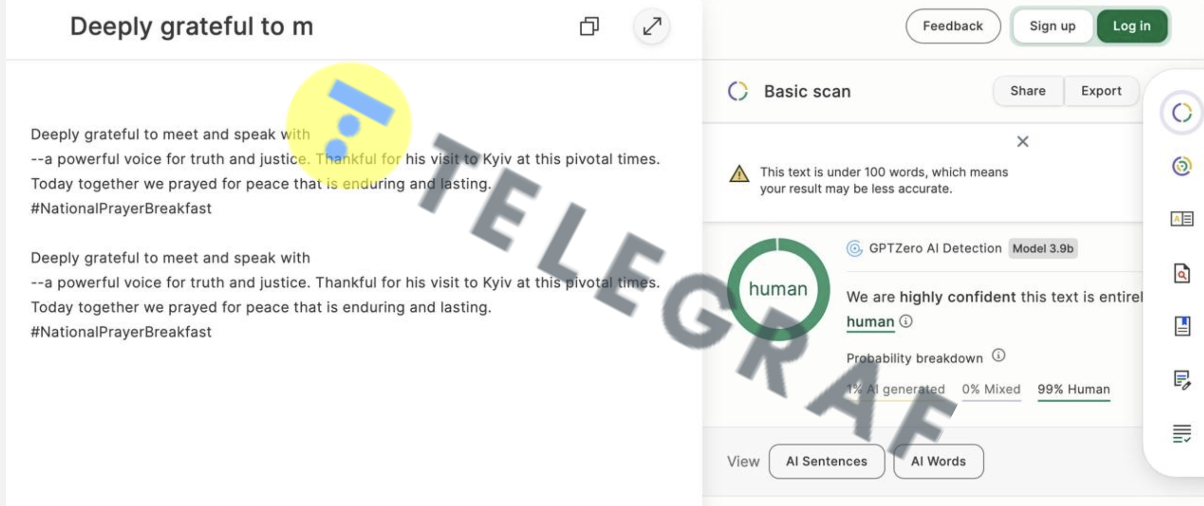 "Телеграф" решил проверить это, используя портал gptzero.me, который определяет уникальность написанных текстов. Этот сайт показывает какие строки были сгенерированы ИИ, а какие нет. Проверяли именно те посты, которые отметил Глушков.