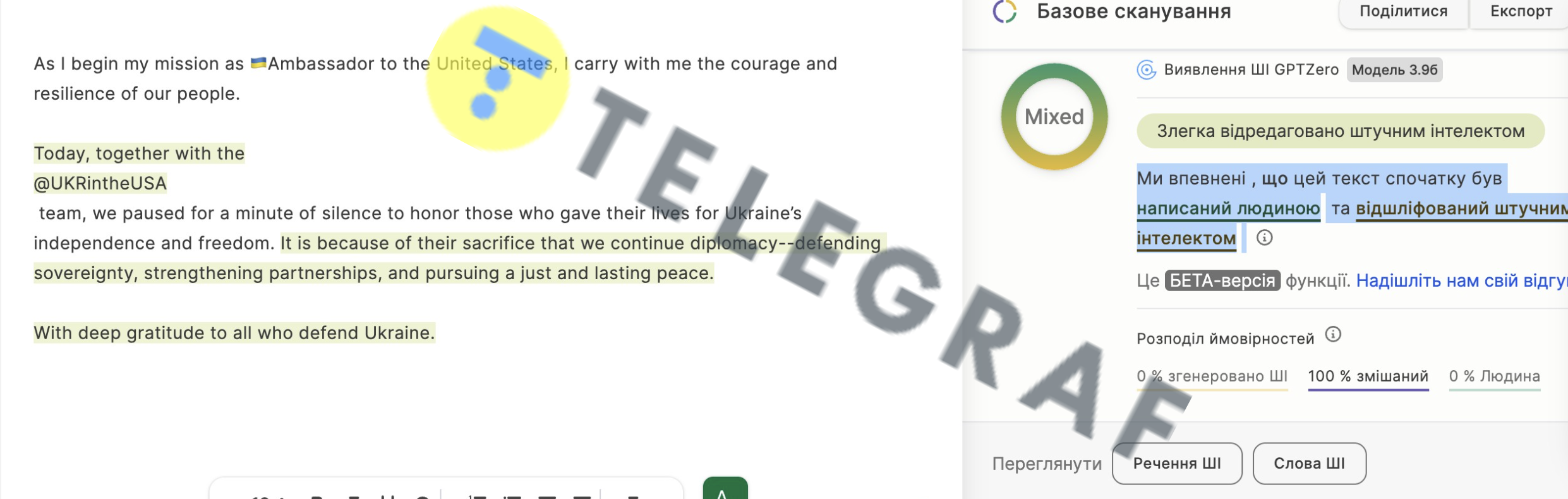 - Третье сообщение о том, что Стефанишина официально начала свою работу на посту посла Украины в США написано с использованием ИИ. Портал назвал этот текст смешанным, и, как видно на фото ниже, выделил строки, которые были сгенерированы искусственным интеллектом.