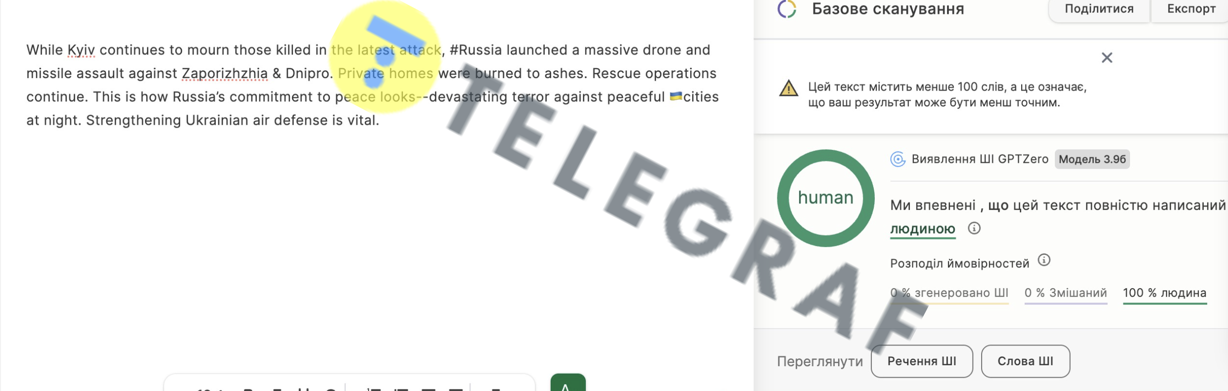 - Первое сообщение о массированном обстреле Запорожья и Днепра 30 августа, по данным портала, написано на 100% человеком. То есть следов использования ИИ не видно.