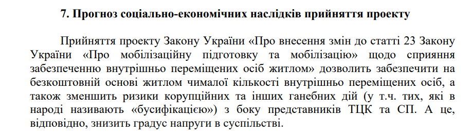 Реализация законопроекта не нуждается в дополнительных средствах из госбюджета. Ожидается, что его принятие позволит обеспечить жильем значительное количество внутренне перемещенных лиц и одновременно минимизировать практики, называемые в обществе "бусификацией".